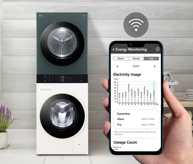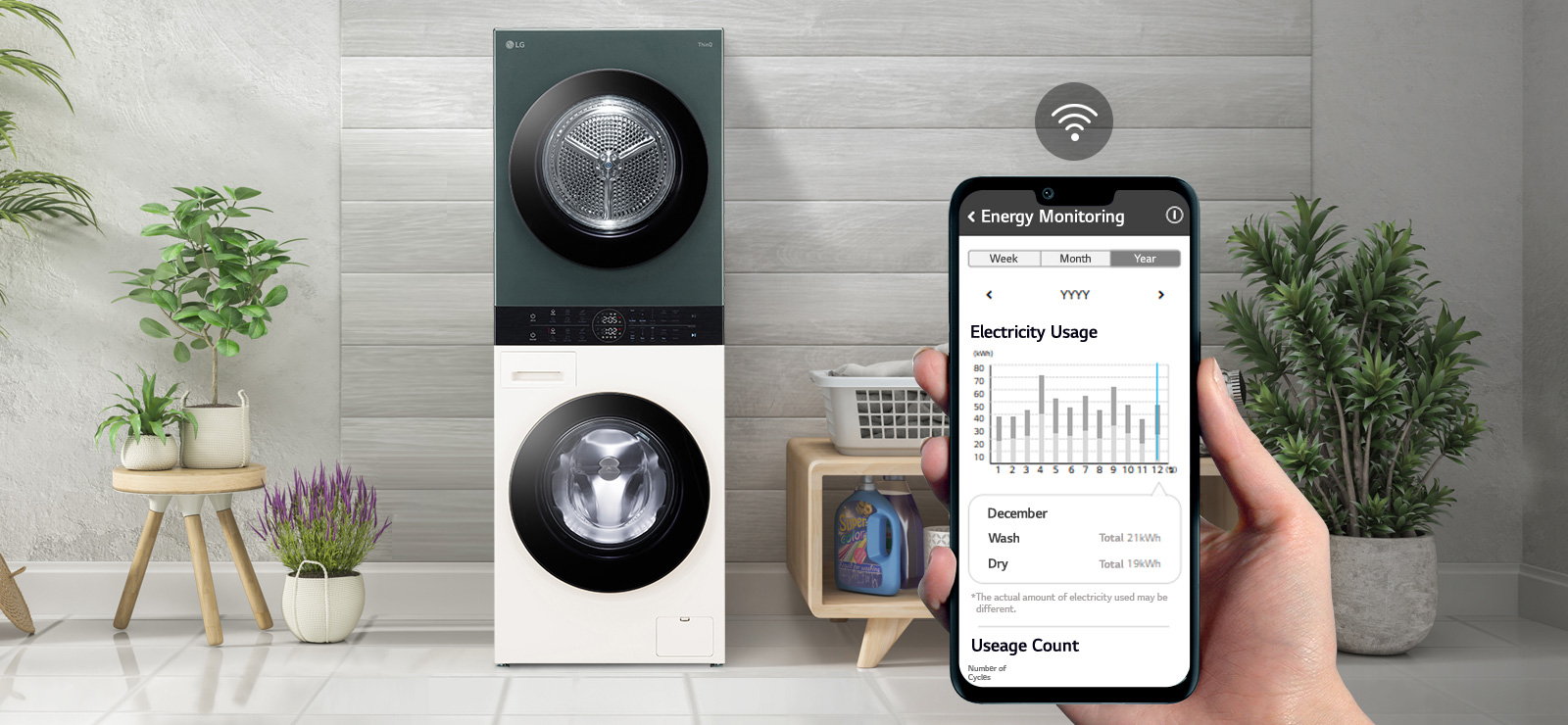 Preko aplikacije LG ThinQ™ lahko spremljate delovanje in porabo energije vašega WashTowerja. Prav tako lahko prejmete pametna obvestila o potrebnih vzdrževalnih posegih.*
